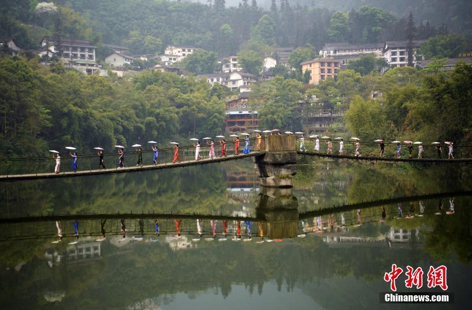 - Le 17 mars, plus de 40 femmes en qipao, robe traditionnelle chinoise fendue sur les côtés, posent sur un vieux pont suspendu au mont Emei, dans la province du Sichuan (sud-ouest).