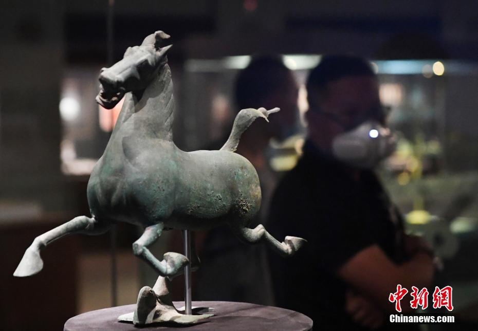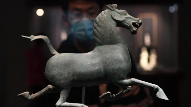 Photos prises le 17 juin, montrant des visiteurs en train d’admirer la sculpture en bronze « le Cheval volant » au musée du Gansu. Cette statue est l’emblème du tourisme en Chine et fait partie des premières reliques culturelles dont l’exposition à l’étranger est interdite.(Photo : Yang Yanmin/Xinhua)