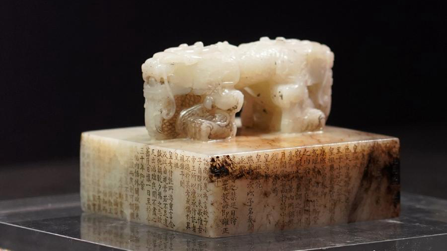 Photo prise le 22 avril 2021 montrant le sceau de jade blanc impérial utilisé par l'empereur Qianlong (1736-1796) de la dynastie Qing (1644-1911) vendu chez Sotheby’s. (China News Service / Zhang Wei)
