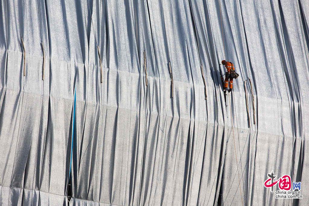 Photos prises le 12 septembre, montrant des ouvriers en train d’emballer l’Arc de Triomphe, à Paris. Il s’agit d’une œuvre posthume de l’artiste Christo, décédé en mai 2020 à New York. Ce projet a nécessité 14 millions d’euros.