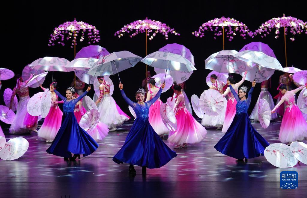 Des artistes présentent un spectacle magique au Grand théâtre du Shandong, le 21 mars 2023. La 11e Exposition acrobatique de Chine se tient du 16 au 29 mars à Jinan, chef-lieu de la province chinoise du Shandong (est). Au total, 50 programmes acrobatiques et magiques ainsi que huit pièces acrobatiques seront présentés à cette occasion dans plusieurs villes du Shandong. (Xu Suhui / Xinhua)