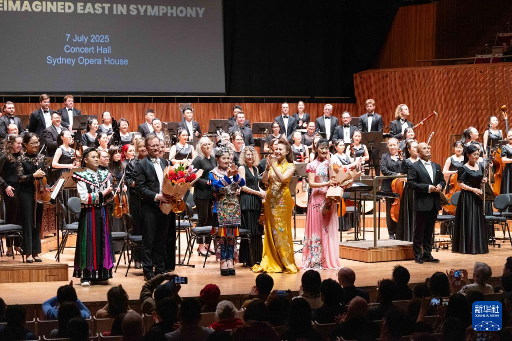 Les membres de la troupe artistique du Guizhou (sud-ouest de la Chine) et de l'Orchestre d'Australie saluent le public après leur concert à l'Opéra de Sydney, en Australie, le 7 juillet 2025. Lundi soir, la salle de concert de l'Opéra de Sydney affichait complet. Devant plus de 2 000 spectateurs enthousiastes, le concert symphonique intitulé « La musique folklorique orientale réinterprétée en symphonie » a été lancé sous un tonnerre d'applaudissements, marquant ainsi sa première représentation en Australie. (Ma Ping / Xinhua)