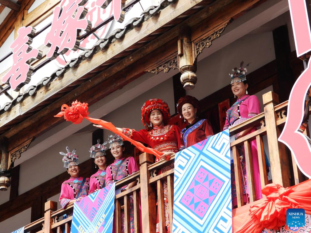 Des gens célèbrent un mariage traditionnel de l'ethnie Tujia dans un site pittoresque de la ville de Dazhou, dans la province chinoise du Sichuan (sud-ouest), le 26 août 2025. Diverses activités sont organisées à travers la Chine à l'approche de la prochaine fête de Qixi, fête traditionnelle qui s'apparente à la Saint-Valentin chinoise et qui tombe cette année le 29 août. (Photo de Deng Liangkui/Xinhua)