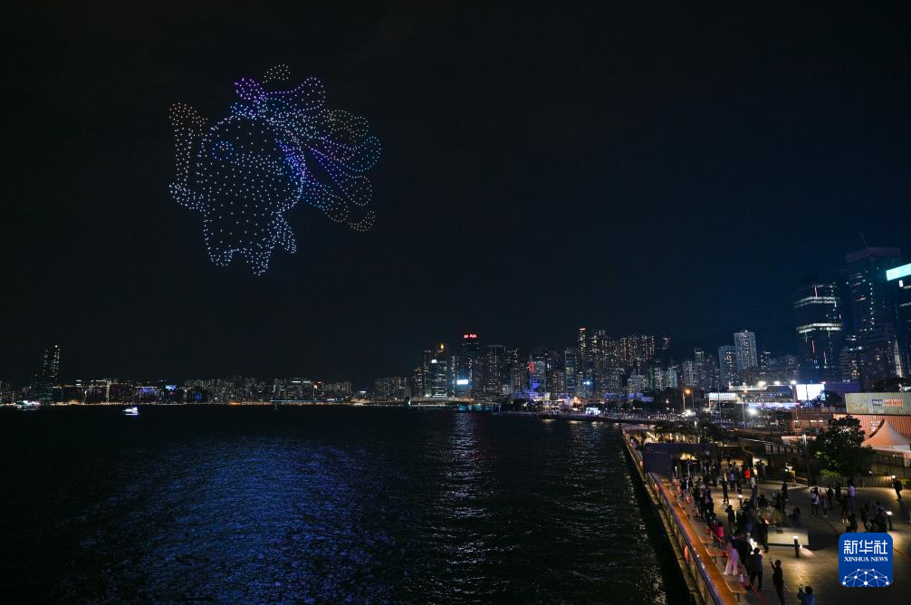 Le 18 novembre, un grand spectacle de drones intitulé « La puissance du sport brille à Hong Kong » a illuminé le port Victoria de Hong Kong. Au total, 1 200 drones ont dessiné dans le ciel nocturne les silhouettes dynamiques des mascottes des 15e Jeux nationaux, « Xi Yang Yang » et « Le Rongrong », ainsi que des scènes d'épreuves sportives telles que de l'escrime, du basketball ou encore du tir à l'arc, attirant un large public. (Chen Duo / Xinhua)