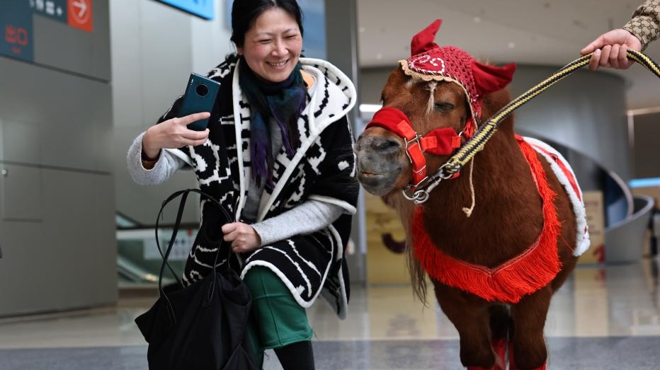 Une jeune fille chevauche un poney Shetland lors de l'exposition scientifique et culturelle « Merveilles galopantes : Année du Cheval », au Musée des sciences et technologies de Shanghai, le 10 février 2026. Organisée conjointement par le Musée des sciences et technologies de Shanghai et le Musée du Palais de Beijing, l'exposition a été inaugurée mardi. (Xinhua/Fang Zhe)