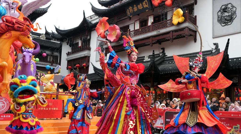 Photo prise le 2 mars 2026, montrant un spectacle d'art populaire lors des célébrations de la fête des Lanternes au jardin Yuyuan de Shanghai. Diverses activités ont été organisées cette année au jardin Yuyuan, attirant de nombreux touristes. (Xinhua/Liu Ying)
