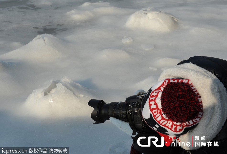 2013年1月4日,受极寒天气降温影响,青岛胶州湾海域出现白茫茫一片冰封,随着潮汐,近岸部分惊现罕见的“冰火山”奇观。