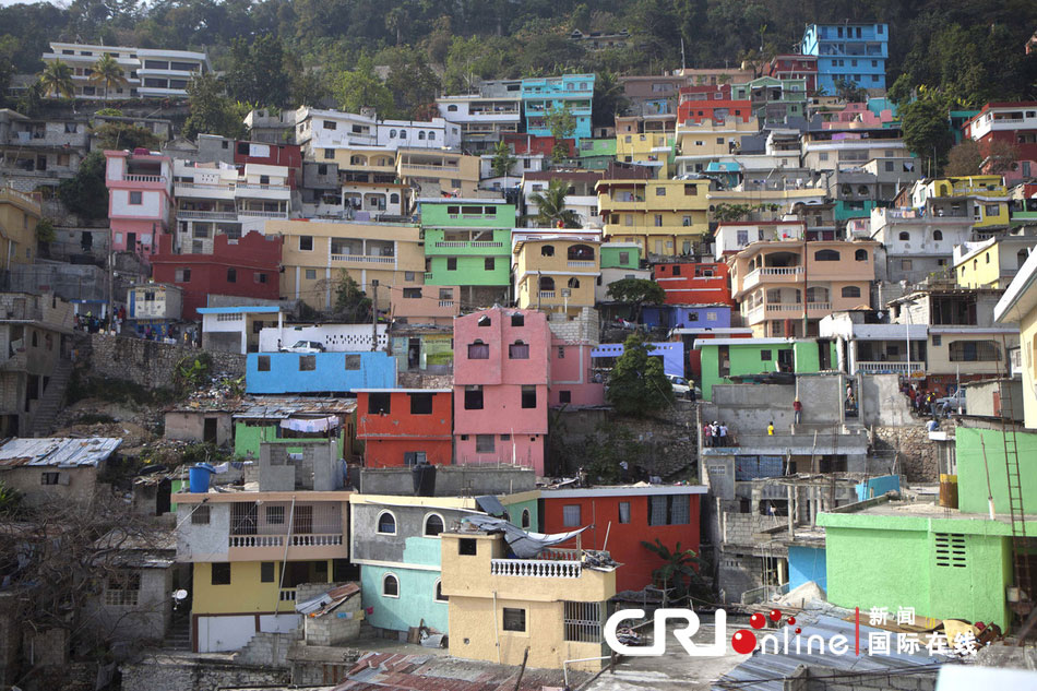 当地时间2013年3月21日,海地佩蒂翁维尔,粉刷成彩色的雅卢西煤渣棚户区。根据从海地著名画家Prefete Duffaut的作品中获得的灵感,工人们本月开始为海地最大的棚户区--雅卢西煤渣棚户区的房屋外墙粉刷彩色涂料。