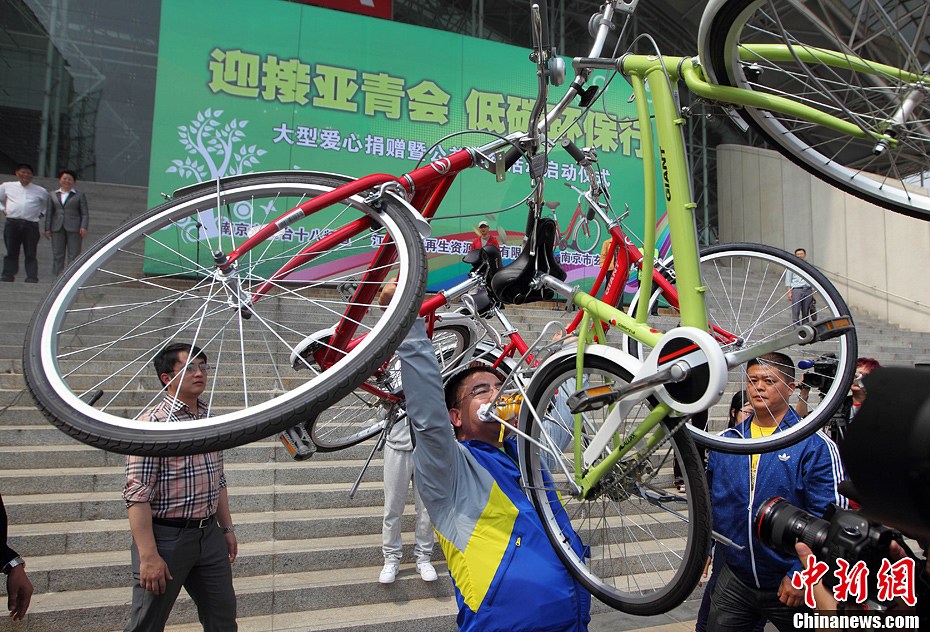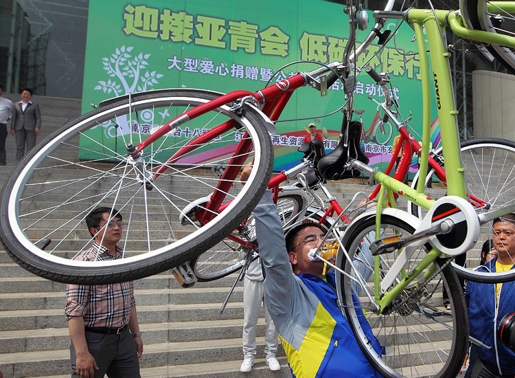 Le 17 avril, une donation a eu lieu à Nanjing, pour promouvoir la circulation à faible émission et accueillir les Jeux Asiatiques de la jeunesse 2013. Chen Guangbiao, célèbre entrepreneur et philanthrope chinois, a ainsi offert des vélos aux travailleurs et citoyens locaux (agents d'entretien, agents sanitaires et personnes démunies), dans le but de promouvoir la circulation à faible émission. Il a profité de l'occasion pour exhiber ses talents de cycliste.
