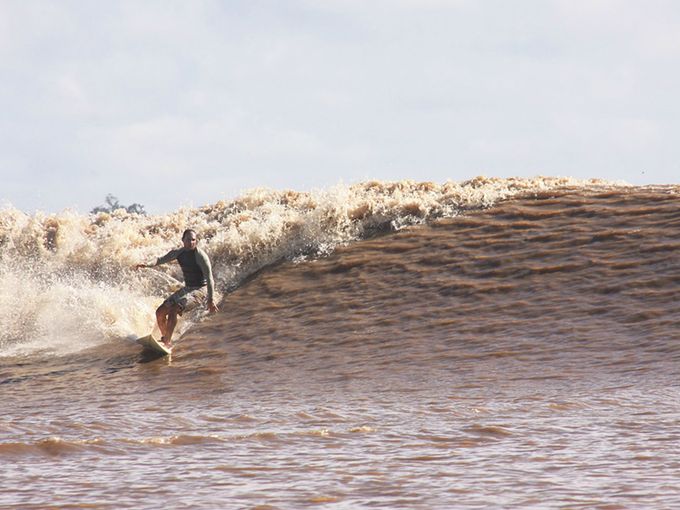 La vague du mascaret Pororoca sur l'Amazone, au Brésil.