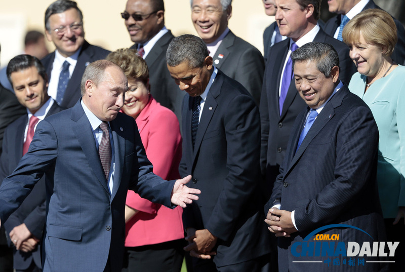 G20拍全家福奥巴马低头不看普京 普京摊手表无奈