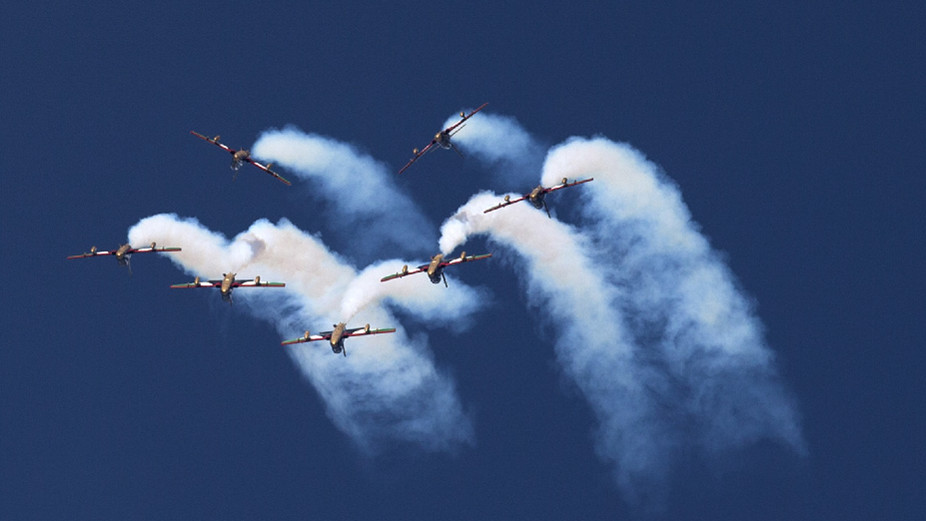 - Le 19 novembre à Dubaï, la patrouille acrobatique Al Fursan de la force aérienne des Emirats arabes unis a exhibé ses techniques de voltige devant les visiteurs du Salon aéronautique de Dubaï.