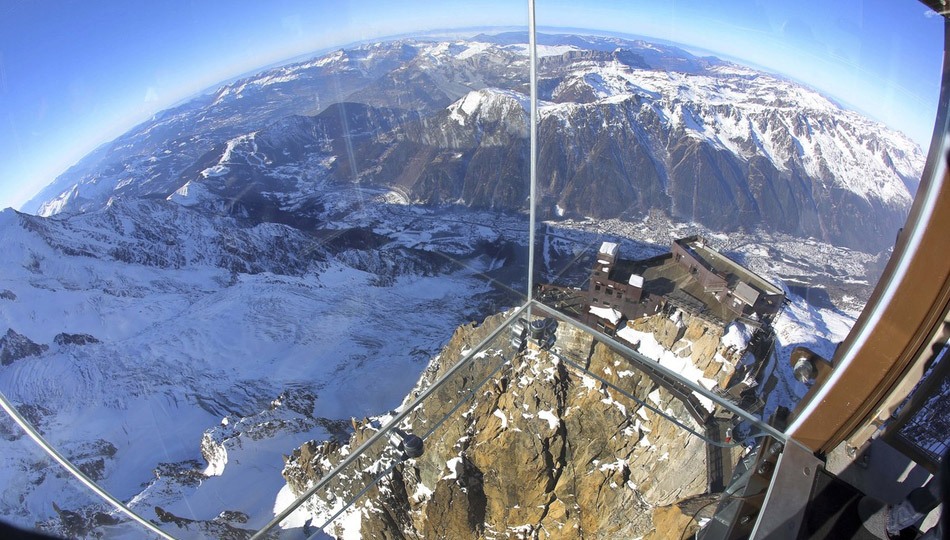 Photo prise le 17 décembre au sommet des Alpes françaises, un journaliste admire les Alpes depuis une cabine en verre transparent. Il s'agit d'une plate-forme touristique baptisée « Pas dans le Vide », construite voilà peu au sommet de l'Aiguille du midi à 3 842 mètres d'altitude.