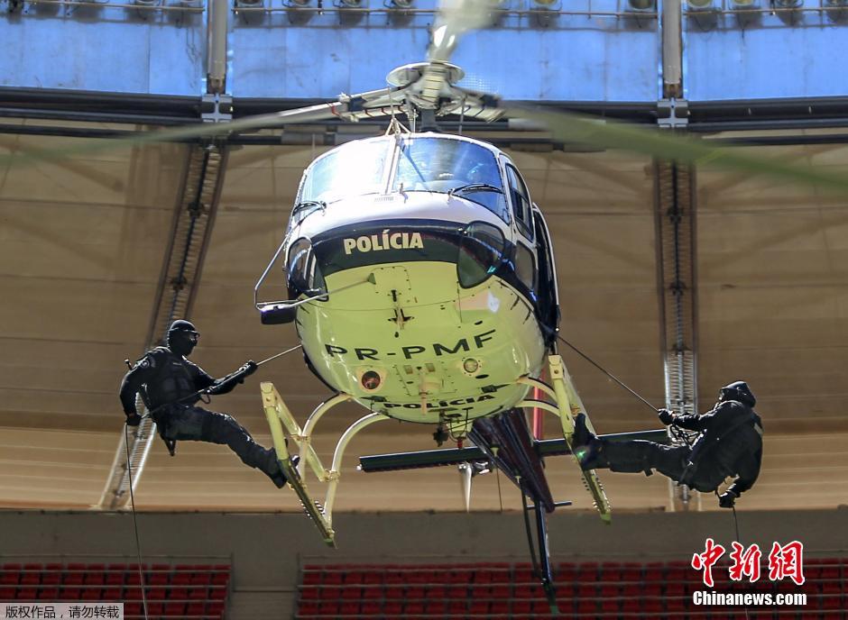 - Le 19 mars, des policiers des forces spéciales brésiliennes ont débarqué en hélicoptère dans le stade national de Brasilia pour procéder à des exercices anti-terroristes.