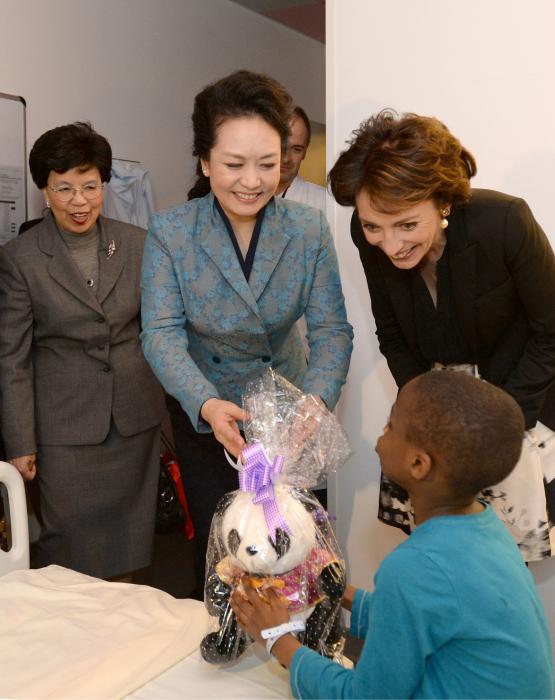 - La première dame de Chine Peng Liyuan est allée dans un hôpital à Paris, où elle a rendu visite à un enfant malade de l'asthme et lui a offert une peluche en forme de panda.