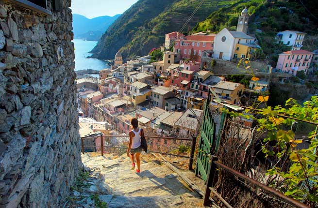 Située en Italie, les Cinque Terre comprennent cinq villages contemplant la Méditerranée. Façades multicolores, clochers, papillons et fleurs… chaque village possède un charme unique.