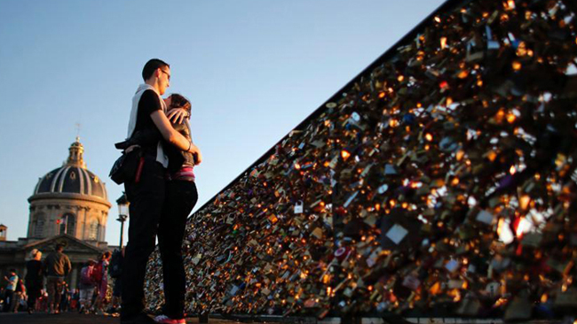 当地时间6月8号下午17点50分,巴黎著名的艺术桥上(Pont des Arts)一段长2.4米的安全护栏网不堪承受铁锁的重负,被压垮,所幸没有造成人员伤害。目前,巴黎市的官方网站则呼吁游客改用"电子爱情锁"。