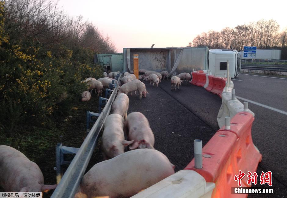 Des dizaines de cochons se sont échappés d'un camion après un accident au niveau de Poitiers (Vienne), mercredi 13 janvier. Un semi-remorque transportant 190 cochons s'est renversé sur l'autoroute, et les animaux ont en profité pour s'échapper.