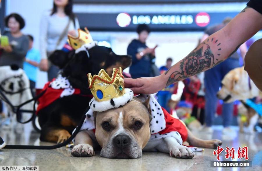 - Des chiens portent des costumes d'Halloween, dans le cadre d'un programme visant à soulager le stress lié aux voyages aériens, à l'aéroport de Los Angeles, en Californie, le 28 octobre 2016.