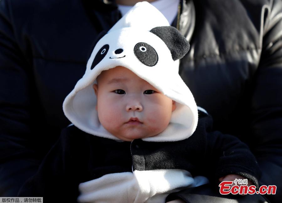 Miu Suwazono, petit bébé de six mois, porte un costume de panda géant en attendant la première apparition publique du bébé panda Xiang Xiang, née de sa mère Shin Shin le 12 juin 2017, au zoo d’Ueno, à Tokyo, au Japon, le 19 décembre 2017. (Photo / Agences)