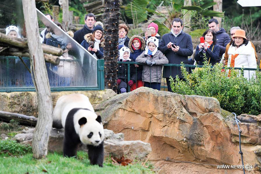Des visiteurs observent le panda géant mâle Yuan Zi, le père du bébé panda Yuan Meng, au Zooparc de Beauval, à Saint-Aignan, dans le centre de la France, le 13 janvier 2018.