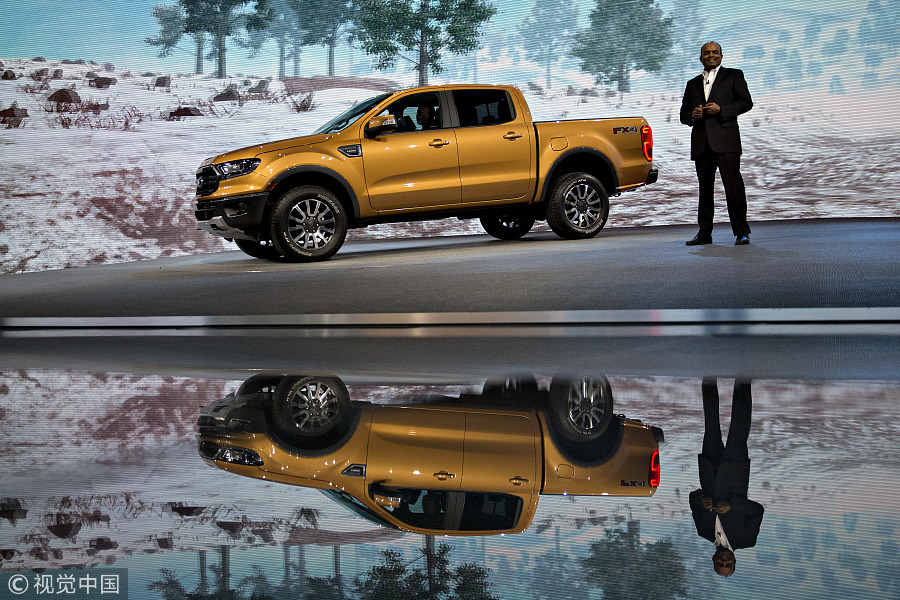 Raj Nair, vice-président exécutif et directeur technique du développement des produits chez Ford Motor Co, s'exprime à côté d'une camionnette Ford Ranger de taille moyenne 2019 lors du Salon international de l'auto d'Amérique du Nord (North American International Auto Show, NAIAS) 2018, le 14 janvier 2018 à Detroit.