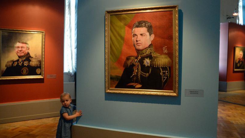 Un enfant se promène devant les portraits de l'ancien manager écossais de Manchester United, Sir Alex Ferguson (à gauche) et du footballeur portugais Cristiano Ronaldo (à droite), exposés dans le cadre du projet artistique Like the Gods (Comme des dieux), présenté par le Musée de l'Académie des Arts de Russie et l'artiste italien Fabrizio Birimbelli lors de la Coupe du Monde 2018 en Russie, le 20 juin 2018 à Saint-Pétersbourg. Le projet présente une série de portraits de stars et d'entraîneurs du football mondial en tenues historiques et comprend plus de 40 portraits.