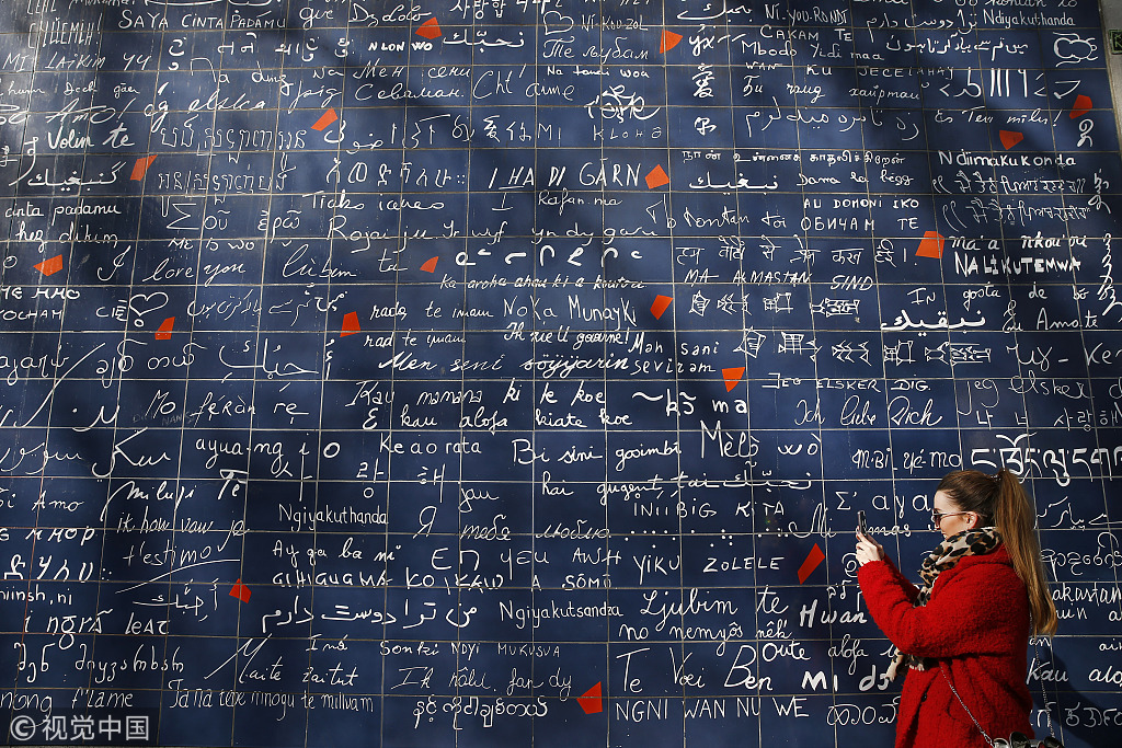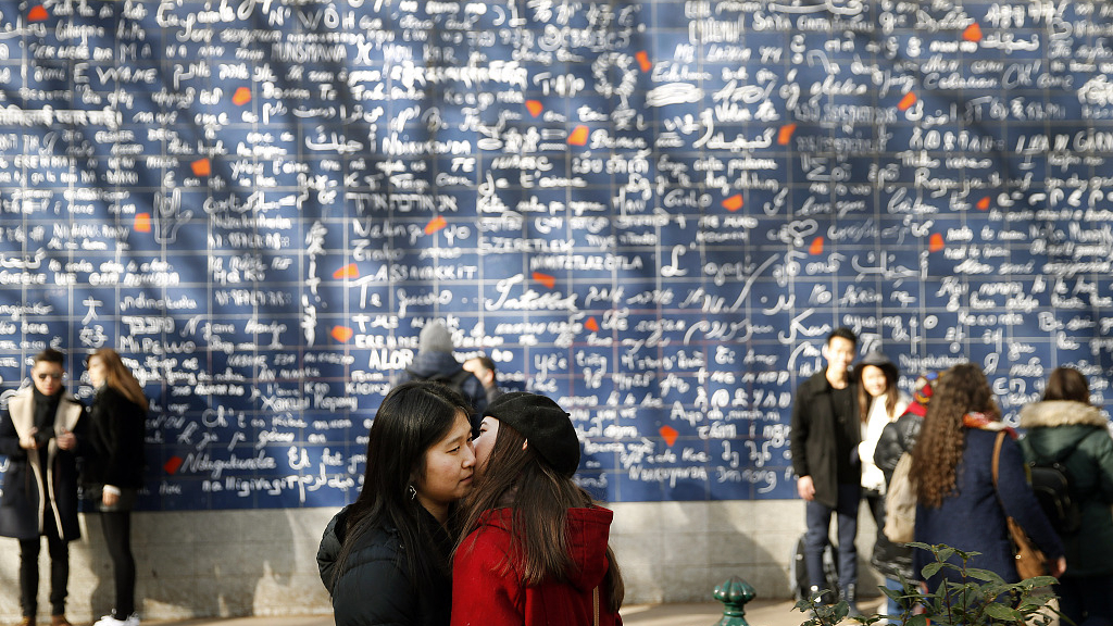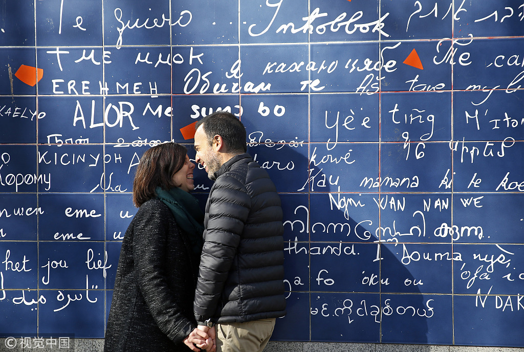 Pour la fête de St-Valentin, de nombreux couples se sont rendus devant le mur de l'amour à Paris, sur lequel sont écrits les mots « Je t'aime » dans de nombreuses langues différentes. Des amoureux s'embrassent devant le mur pour garder un beau souvenir de ce jour spécial.