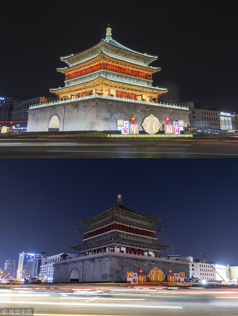 Combinaison de photos montrant la Tour de la Cloche avant (en haut) et pendant l’Heure de la Terre à Xi’an, dans le nord-ouest de la Chine. (Photo / VCG)
