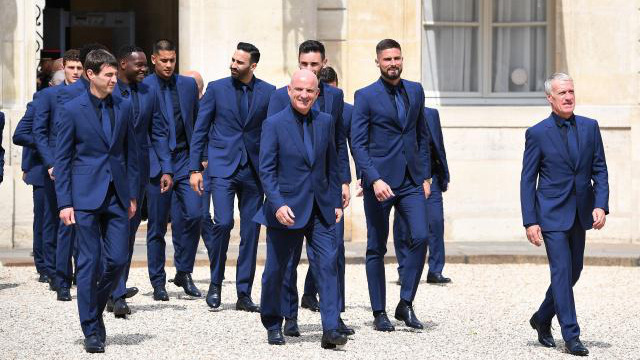 Les champions du monde et le staff de l’équipe de France de football, tous habillés d'un même costume bleu marine, étaient au palais présidentiel mardi après-midi pour recevoir la Légion d’honneur après leur victoire au Mondial 2018.