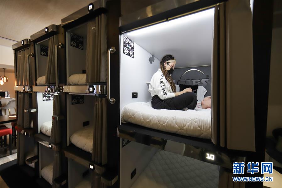 Photos prises le 6 août dans la ville de Bogota, en Colombie, montrant un hôtel capsule toujours ouvert au public durant la pandémie de COVID-19, à condition que tout le monde porte un masque.