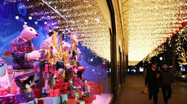 Deux enfants s'arrêtent pour regarder la vitrine de Noël aux Galeries Lafayette à Paris, le 22 novembre 2020. Des grands magasins de France ont récemment dévoilé leurs vitrines de Noël, bien qu'ils soient encore fermés à cause du deuxième confinement. (Photos : Gao Jing/Xinhua)