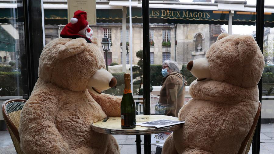 Après la fermeture des cafés et des restaurants à Paris,des ours en peluche ont été placés dans le café Les Deux Magots pour détendre l'atmosphère.