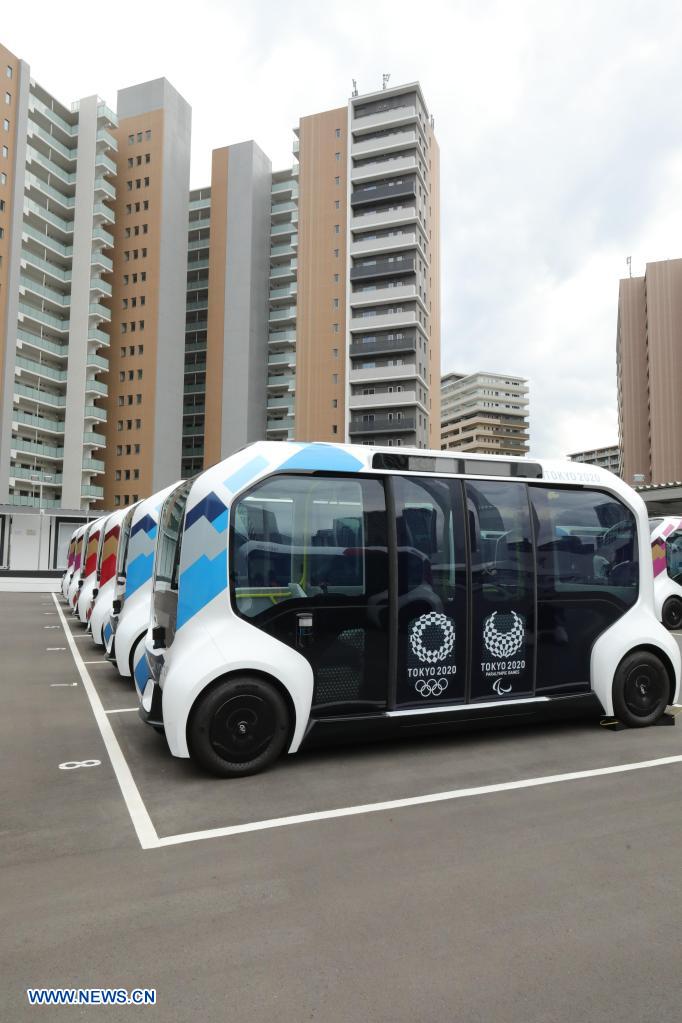 Photo montrant des véhicules électriques autonomes à l'intérieur du village olympique construit pour les Jeux Olympiques de Tokyo 2020, le 20 juin 2021 à Tokyo, au Japon. (Wang Zijiang / Xinhua)