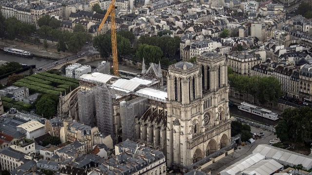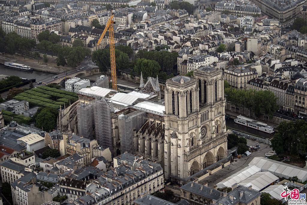 Photo prise le 12 juillet lors d’exercices aériens de l'Armée de l’air française, montrant une vue aérienne de la cathédrale Notre-Dame de Paris en restauration. Les travaux de restauration de la cathédrale se poursuivent toujours, deux ans après l’incendie qui a frappé le monument. (Photos : Aurélien Meunier/VCG)