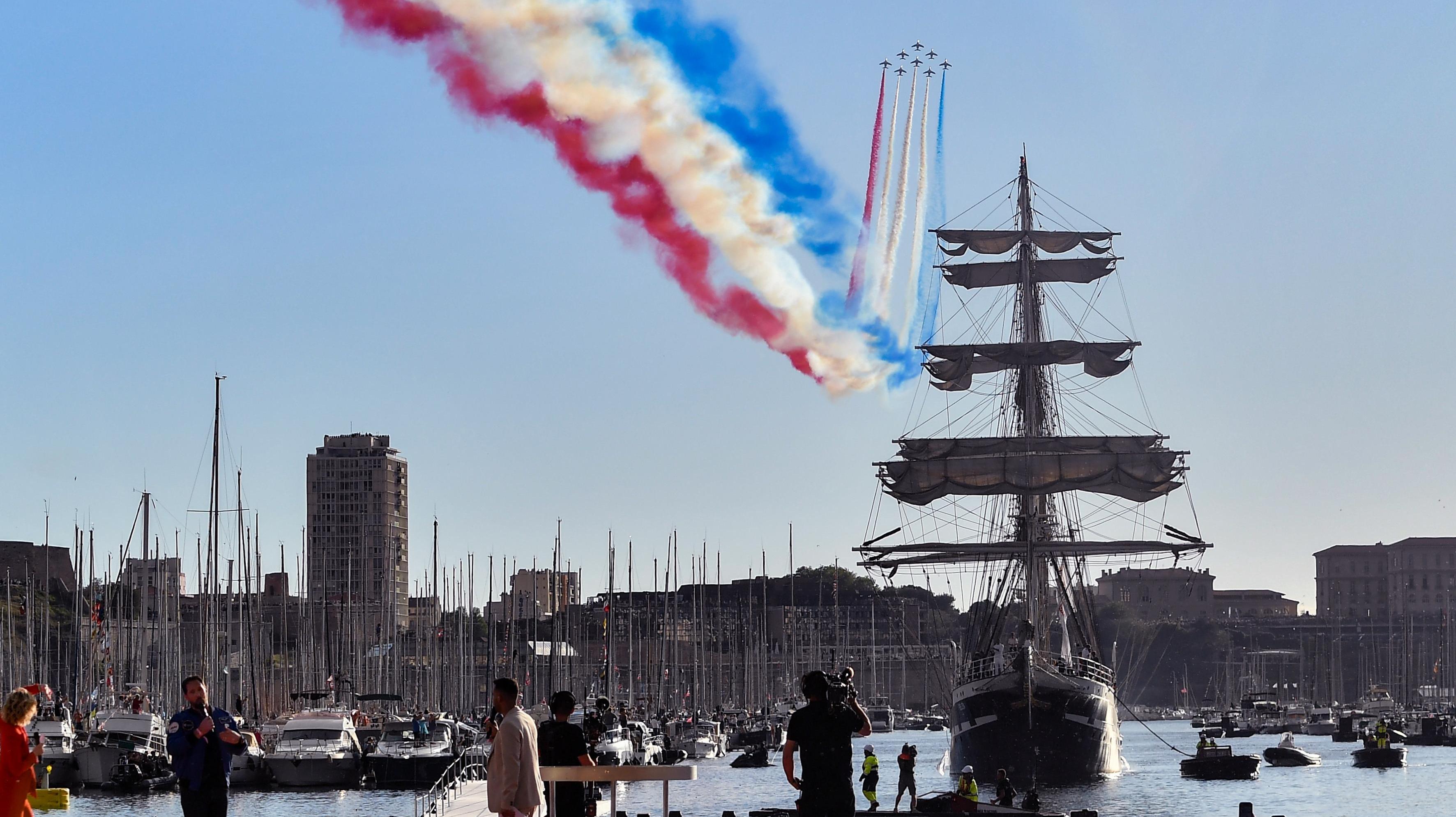 La flamme olympique arrive sur le Vieux-Port de Marseille dans une atmosphère enflammée