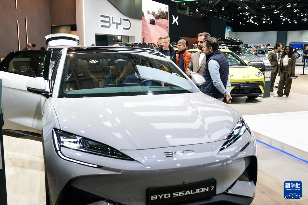 Des visiteurs découvrent le stand de BYD au Salon de l'automobile de Bruxelles 2026, en Belgique, le 10 janvier 2026. Le Salon de l'automobile de Bruxelles 2026 a ouvert ses portes le 9 janvier au Parc des expositions de Bruxelles. Des véhicules électriques chinois de marques telles que NIO, BYD et XPeng y sont exposés, constituant l'un des points forts de l'événement. (Peng Ziyang / Xinhua)