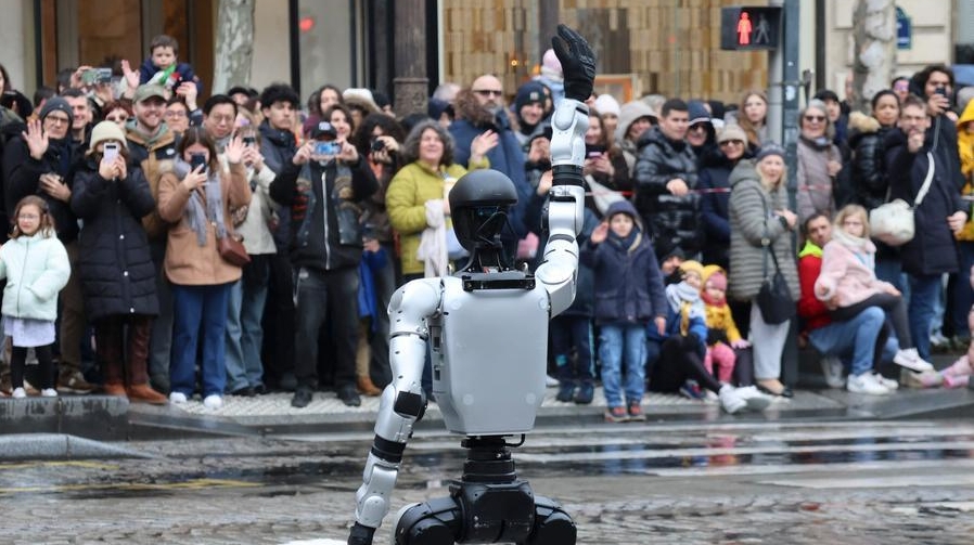 Le robot, marchant d'un pas assuré en tête d'un cortège d'environ 800 artistes, s'est retourné, a marqué une pause et a salué les spectateurs au rythme de la musique, suscitant des acclamations et des photos souvenirs sur les smartphones brandis par la foule massée le long du boulevard.