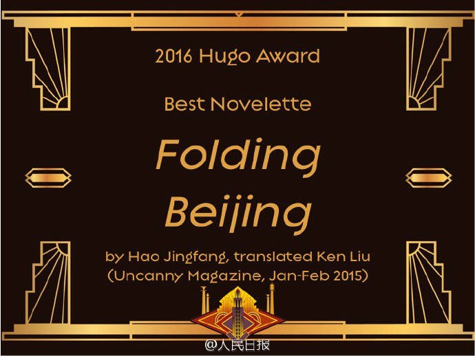 L'auteur chinoise Hao Jingfang a reçu le Prix 2016 Hugo de la Meilleure nouvelle pour son roman court, Folding Beijing, écrit en seulement trois jours. Le prix a été annoncé lors de la Convention mondiale de la science-fiction, MidAmeriCon II, qui a eu lieu à Kansas City, dans le Missouri, le 20 août 2016.