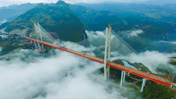 Cette structure de 1341 mètres de long, située à 565 mètres au-dessus d'une rivière, dépasse le pont de la rivière Sidu dans la province du Hubei et devient ainsi le pont le plus élevé du monde, selon les autorités des transports du Guizhou. Zhou Ping, directeur du bureau de gestion des autoroutes, qui supervise la construction, a déclaré à Science and Technology Daily que la hauteur du pont était équivalente à un immeuble de 200 étages.