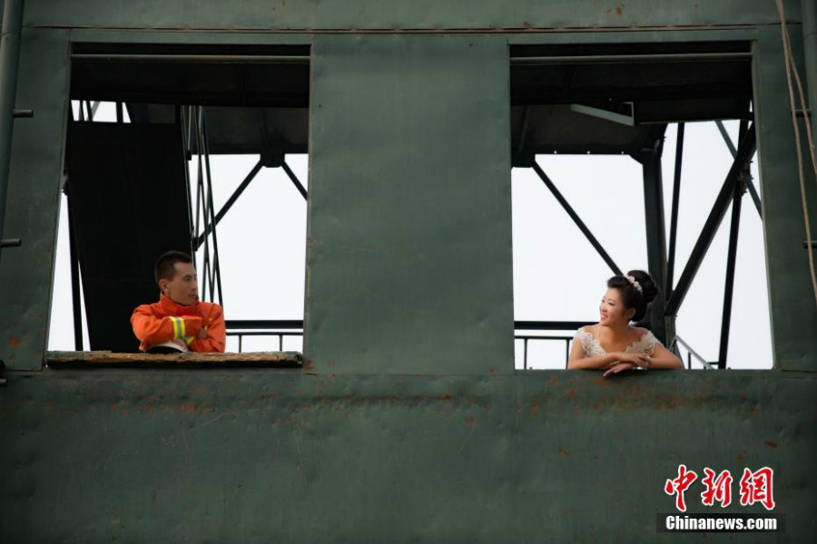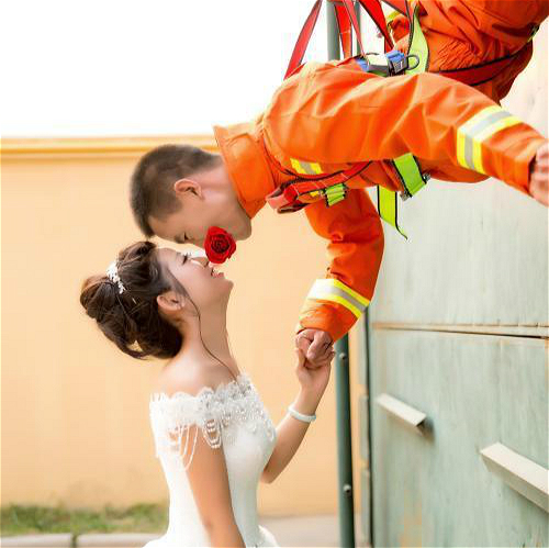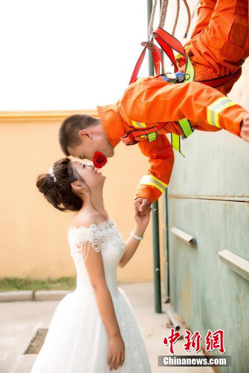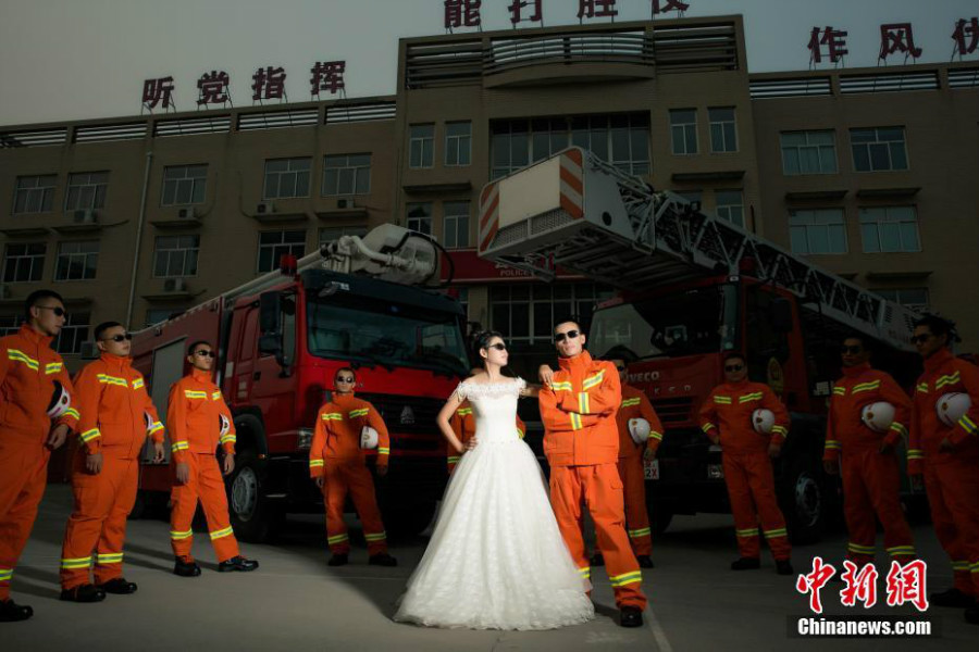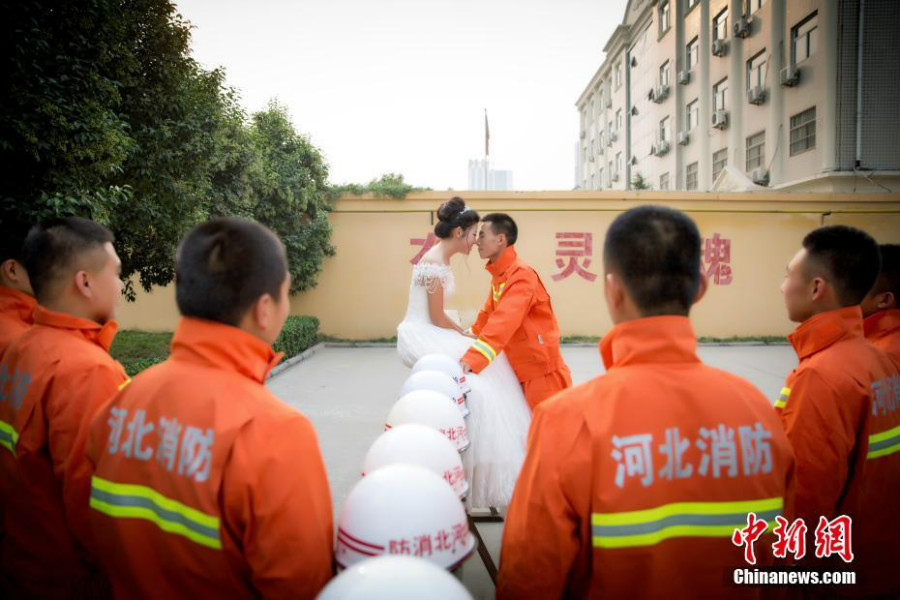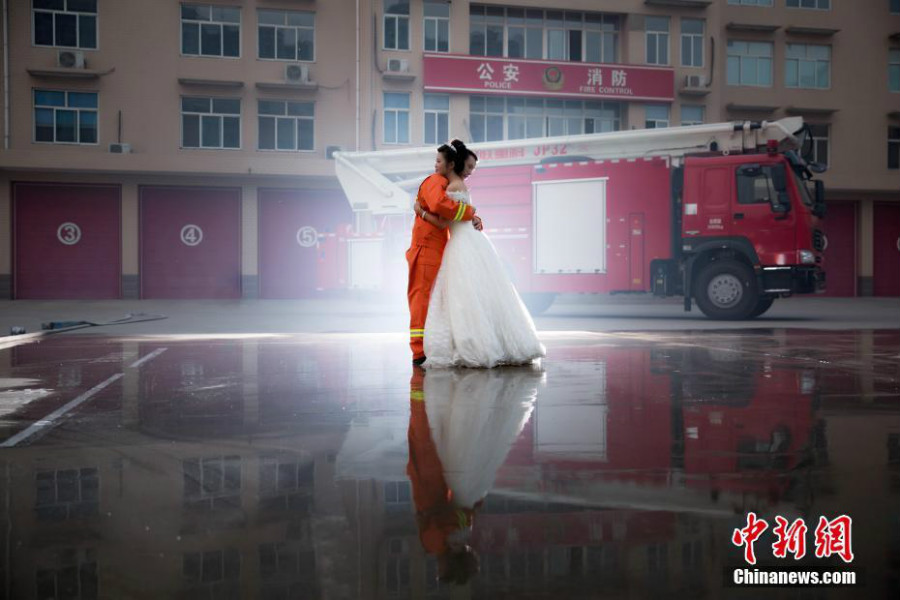 Li Baogang, un jeune pompier de la ville de Xingtai du Hebei (nord de la Chine), a réalisé avec sa femme une série de photos de mariage originales, lui en uniforme des pompiers et son épouse en robe de mariée.