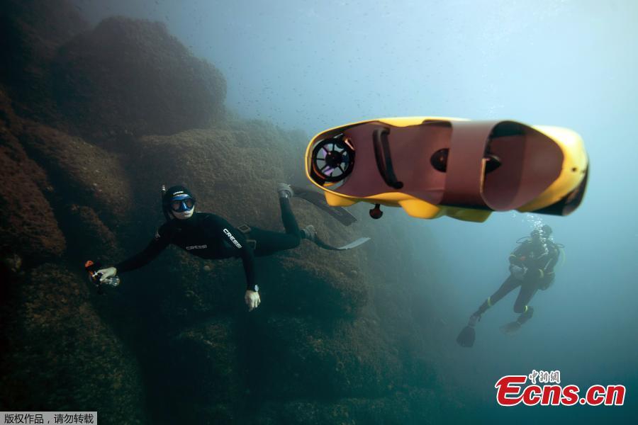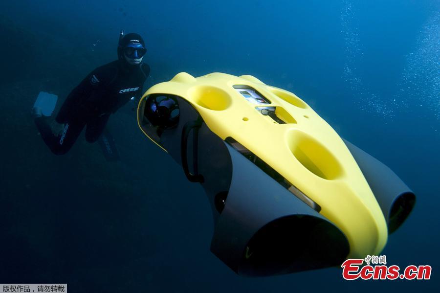 Guillaume Nery, un plongeur français, utilise le premier drone autonome sous-marin appelé « iBubble » pour effectuer des tests lors d'une plongée en Méditerranée au large de Nice (sud-est de la France), le 21 décembre 2017.