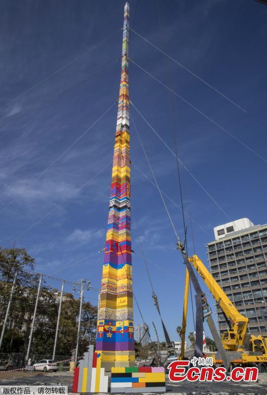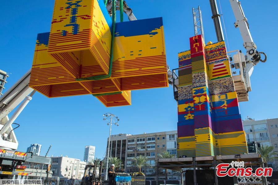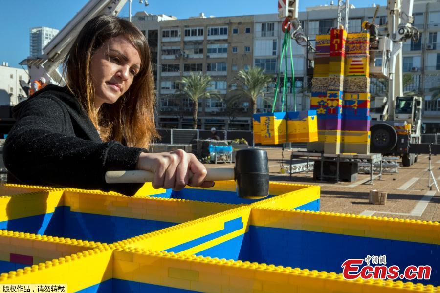 Photo prise le 27 décembre 2017, montrant une tour en Lego en construction sur la place Rabin à Tel Aviv, en Israël, alors que la ville tente de battre le record du monde Guinness de la structure en Lego la plus élevée.