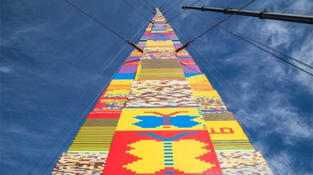 Une femme assemble des briques pendant qu'elle travaille sur un composant de la tour.