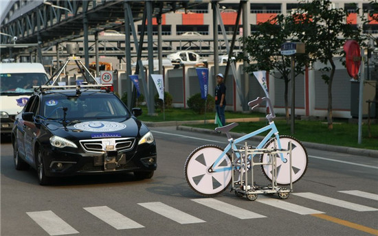 Un véhicule autonome se prépare à effectuer une manœuvre pour éviter une bicyclette en temps réel lors du World Intelligence Drive Challenge à Tianjin (nord de la Chine), le 28 juin 2017. (Photo fournie à chinadaily.com.cn)