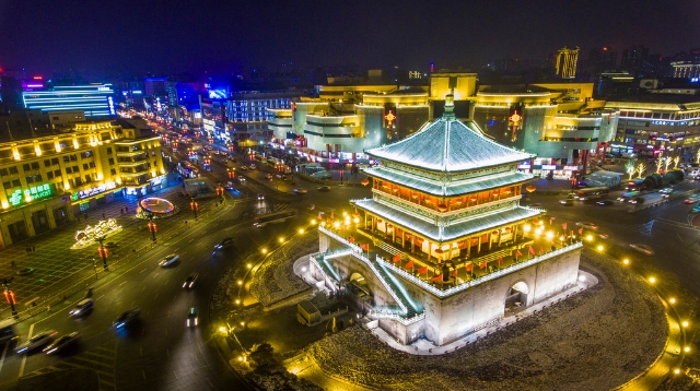 Une vue aérienne de la Tour de la cloche, de bâtiments et de rues la nuit à Xi'an, capitale de la province du Shaanxi (nord-ouest de la Chine), le 9 mars 2018. (Photo / IC)