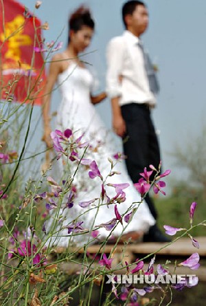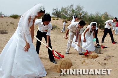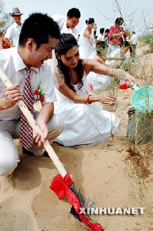 Dans le Ningxia (nord-ouest), des nouveaux-mariés ont célébré leur mariage dans le désert en plantant des arbres ou en faisant des excursions.
