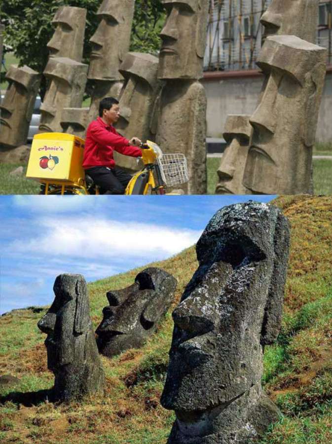 10. Les moaï de l'île de Pâques (en bas) et celles de Beijing (en haut)