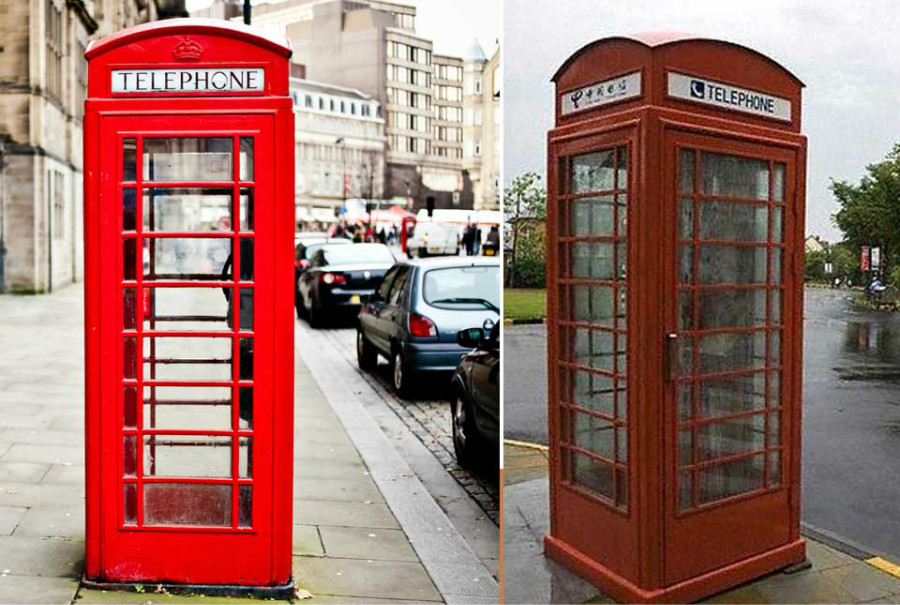 6. Une cabine téléphonique au Royaume-Uni (en haut) et une copie à Shanghai (en bas)