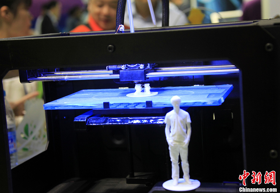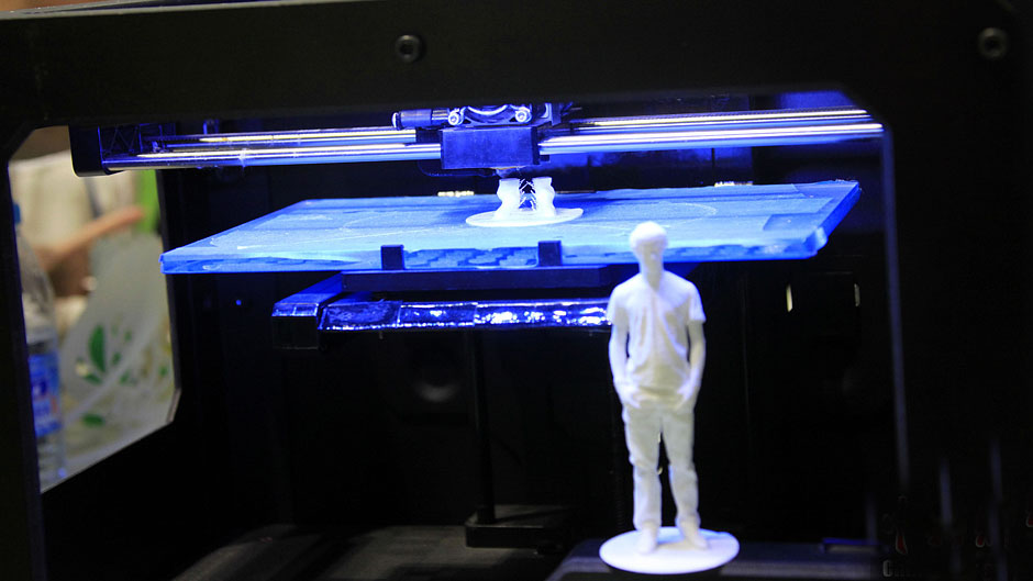 Une imprimante 3D imprime une figurine en plastique dans la salle principale d’exposition.